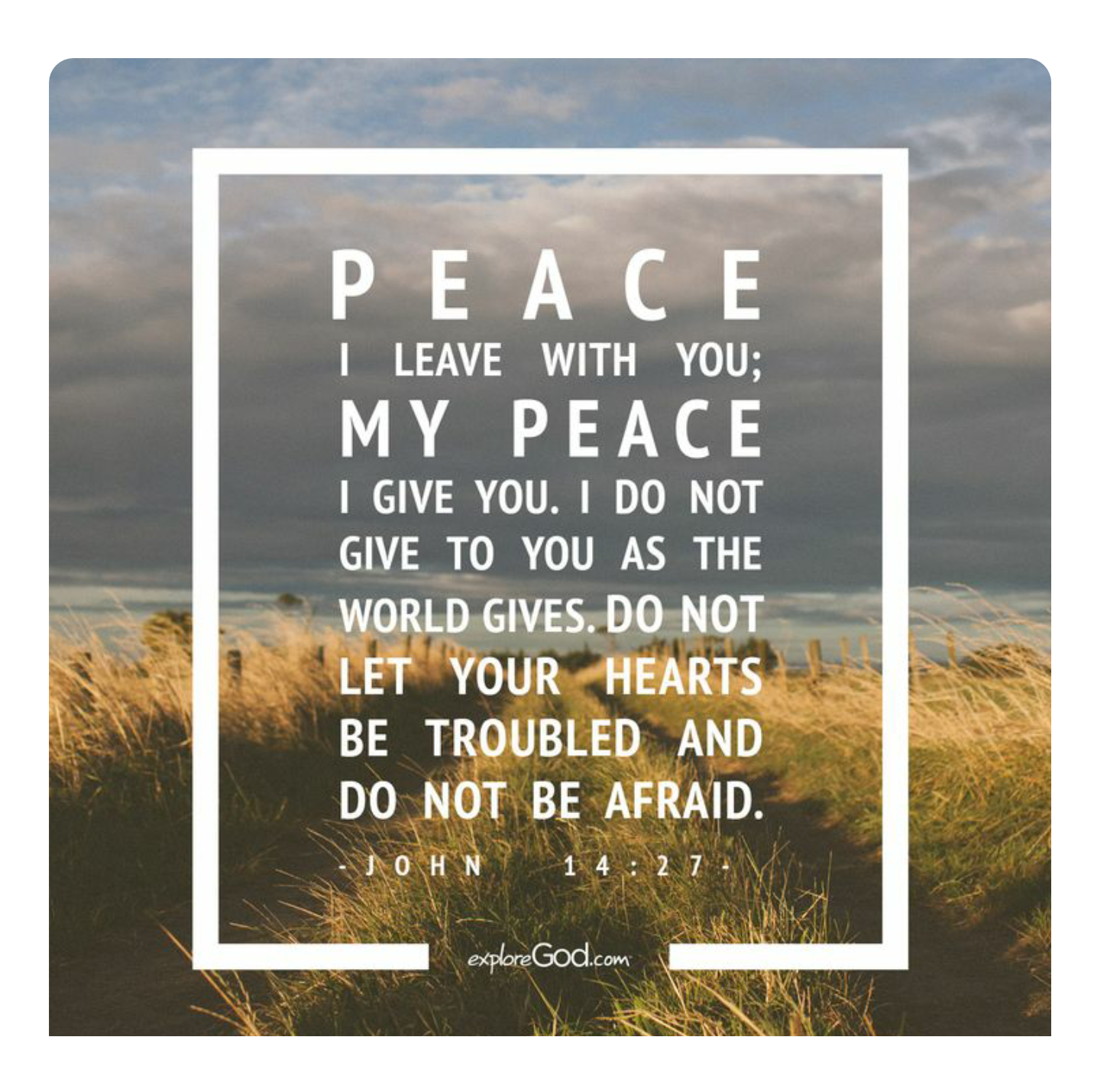 In John 17 vs. 27 Jesus says; Peace I leave with you; my peace I give to you. Not as the world gives do I give to you. Let not your hearts be troubled, neither let them be afraid.
